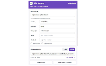 UTM Manager to darmowe rozszerzenie do przeglądarki Chrome, które umożliwia marketerom szybkie i intuicyjne tworzenie linków do śledzenia kampanii. Dzięki automatycznemu wykrywaniu aktualnego adresu URL strony, użytkownicy mogą w kilka sekund generować czyste linki UTM, które są niezbędne do analizy efektywności kampanii marketingowych. Rozszerzenie oferuje prosty interfejs, który pozwala na jednoczesne kopiowanie linków jednym kliknięciem, a także zawiera inteligentne przykłady pól dla szybszej konfiguracji.